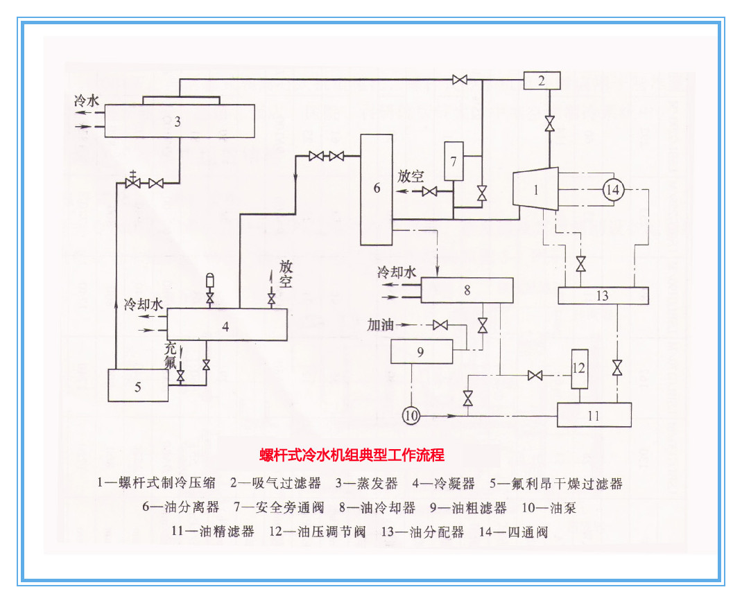 螺桿式冷水機組的典型工作流程如下圖所示,它由制冷系統和潤滑油系統兩部分組成。制冷系統的工作流程為:制冷劑在蒸發器中汽化,所產生的蒸氣經過吸氣過濾器進入壓縮機。制冷劑在壓縮機中被壓縮成高壓氣體,同時潤滑油噴入壓縮機中與制冷劑一起被壓縮,壓縮后潤滑油和制冷劑進入油分離器,其中無油的制冷劑進入冷凝器,在冷凝器中變為飽和液體后進入過冷器過冷,變為過冷液體,然后流向節流閥,經過節流降壓降溫后進入蒸發器。潤滑油系統由油分離器、油冷卻器、油過濾器、油泵、油壓調節閥、油分配器和四通閥組成,其工作流程為:從油分離器分離出來的潤滑油,為避免油溫過高降低潤滑性,先經過油冷卻器進行冷卻,然后在沒泵作用下經過油粗濾器、油精濾器進入油分配器,接著分成兩路進入壓縮同。一路去潤滑軸承并起冷卻作用,另一路去壓縮機噴射。